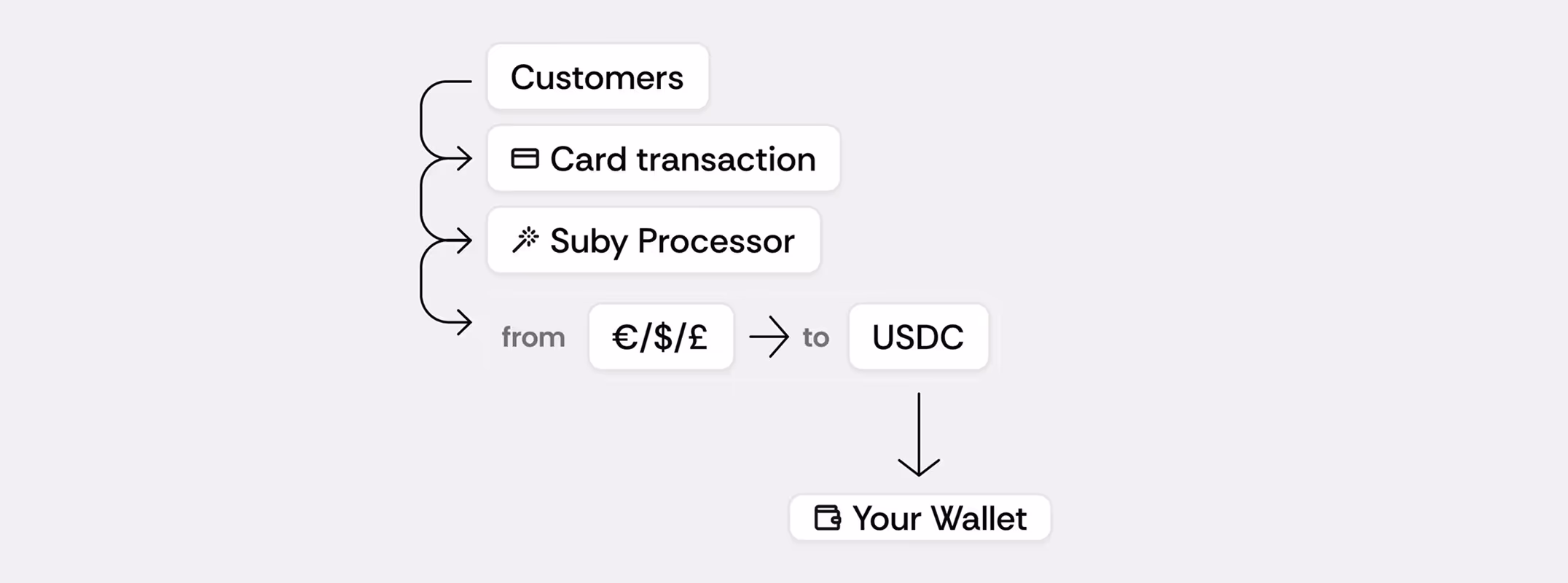 Suby separates payment methods from settlement. Customers choose to pay by credit card or crypto, depending on their preference, while businesses receive payouts in USDC. This approach maximizes conversion for non-crypto users while keeping payouts crypto-native and globally accessible.