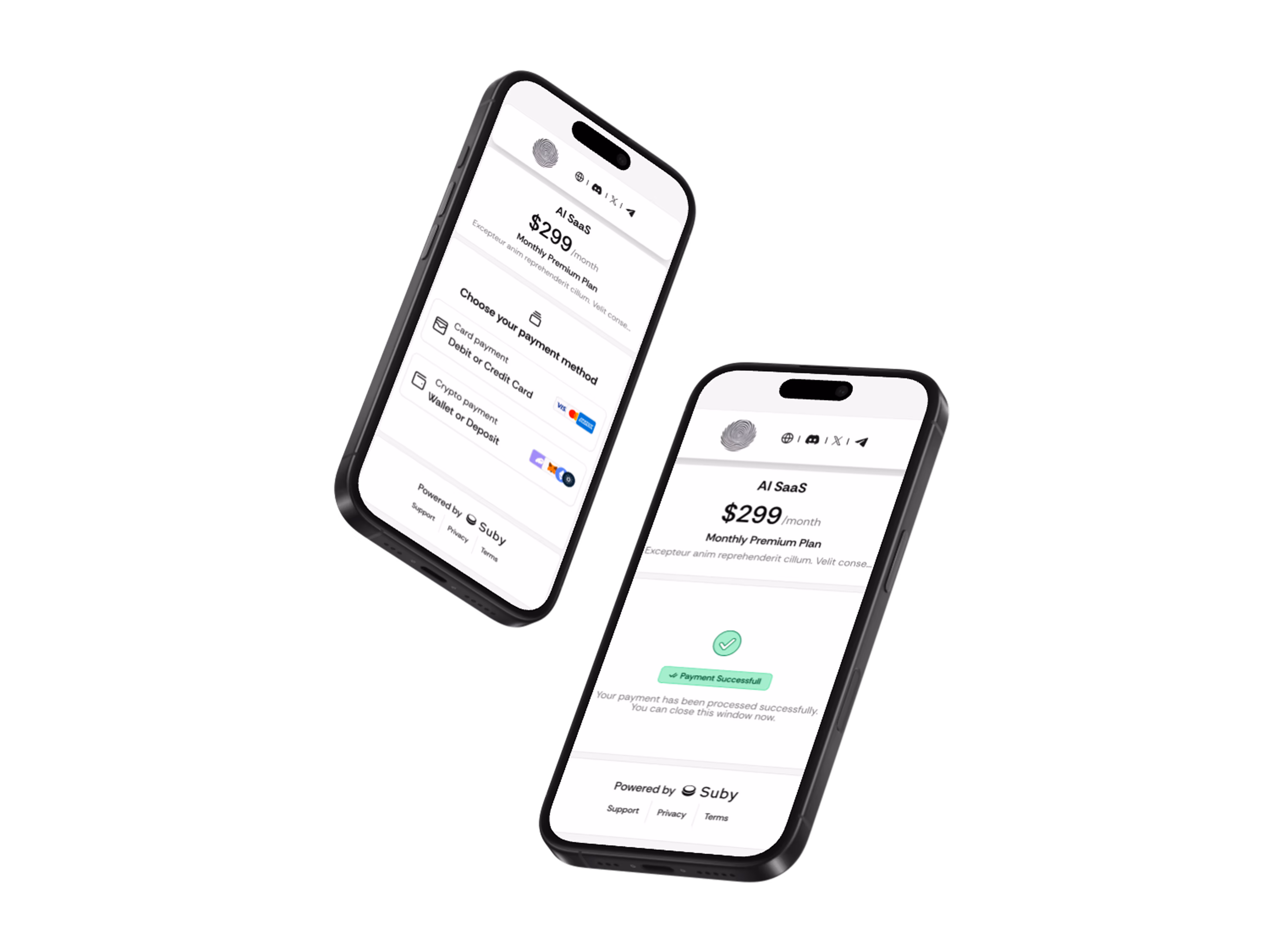 Suby supports both recurring subscriptions and one-time payments. Customers can pay by card or crypto, while businesses manage billing logic automatically and receive USDC payouts. This works for SaaS products, services, and digital access.