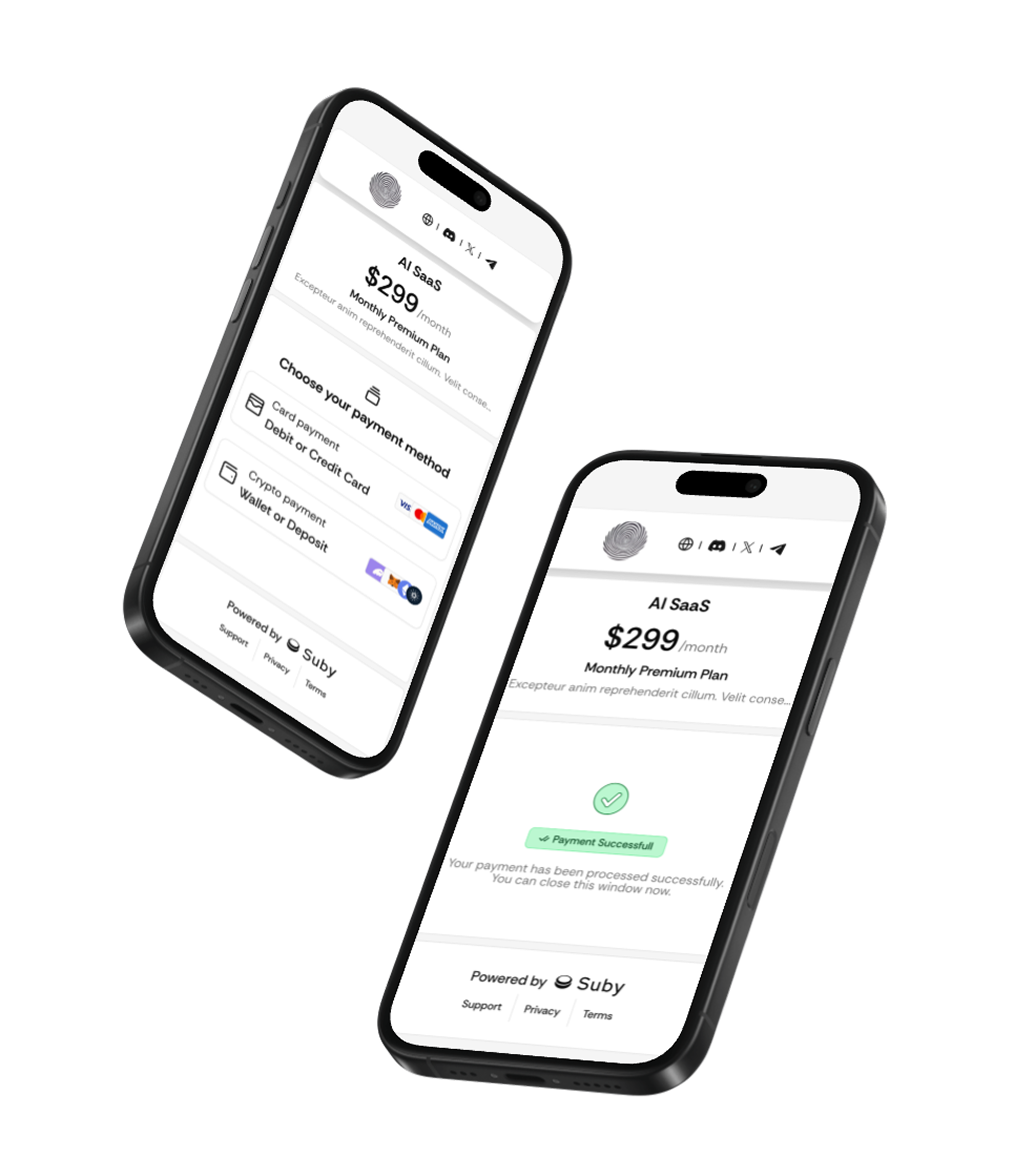 Suby supports both recurring subscriptions and one-time payments. Customers can pay by card or crypto, while businesses manage billing logic automatically and receive USDC payouts. This works for SaaS products, services, and digital access.